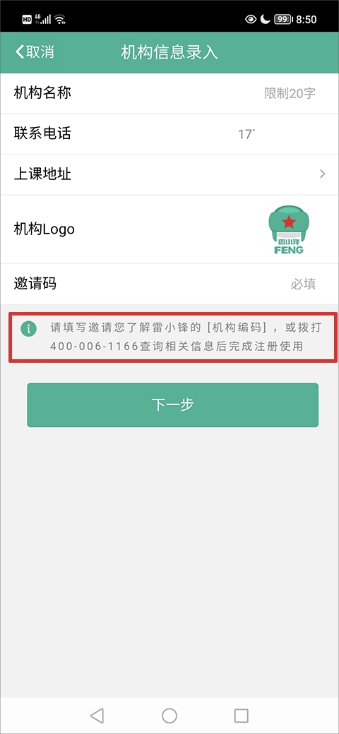 3、接下来,在机构信息录入环节,依次填写机构名称、联系电话、上课地址和邀请码,完成后点击下一步;