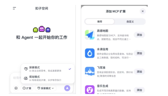 5、接着在输入框里输入文字指令,比如“帮我制定一份北京故宫的旅游规划”,选定探索模式,再添加高德地图MCP,把任务发送给扣子。很快就能得到关于【北京故宫旅游攻略、门票信息、开放时间、游览路线、必看景点】的相关回答。