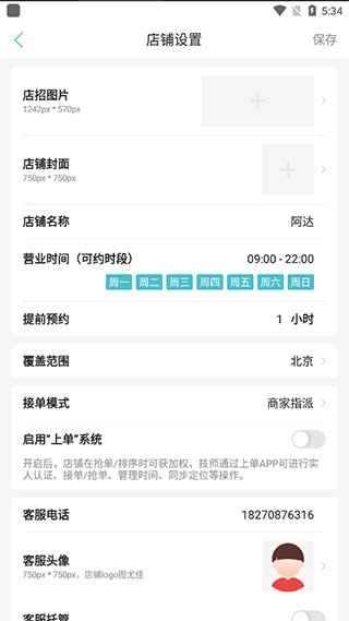 2、用户可以对自己店铺的图片封面、覆盖范围、接单模式等进行设置;
