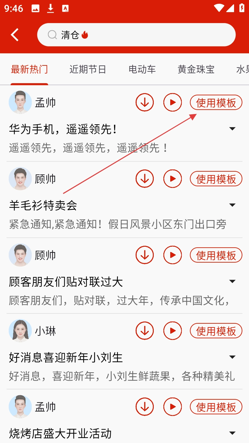 2、在最新热门模板页面,找到适合模版点击【使用模板】,进入配音制作页面。