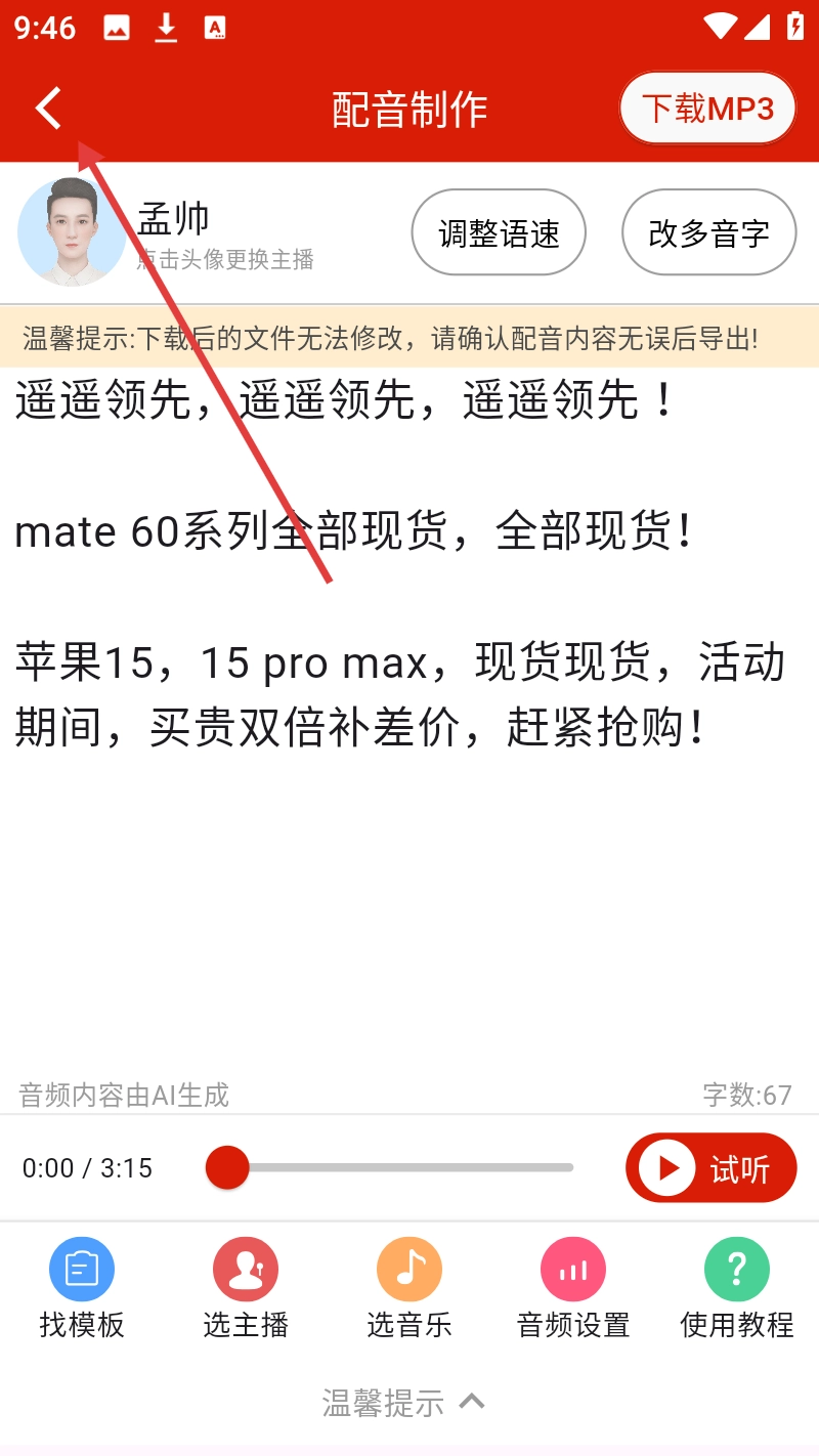 4、模板一键生成:平台海量促销广告模板,无论是文案撰写、背景音乐挑选还是主播声线选择,都能通过一键操作轻松完成,大幅简化制作步骤,助力用户快速打造出高质量的促销语音广告。