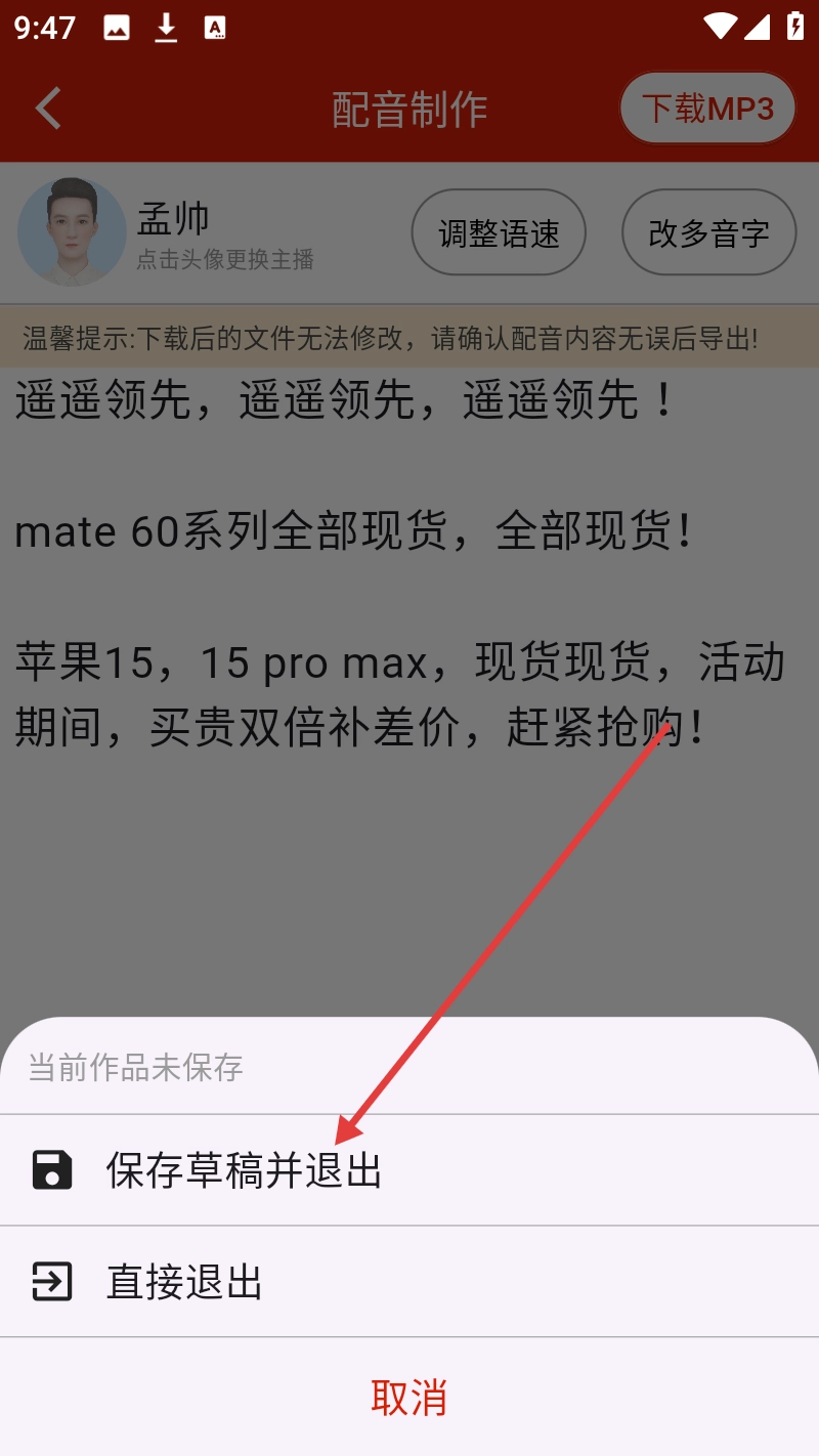 4、在退出选项中点击【保存草稿并退出】,即可保存配音草稿。