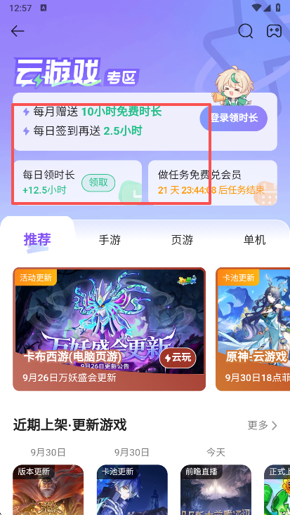 2、您可以看到每天都是可以领取免费的云游戏时长的