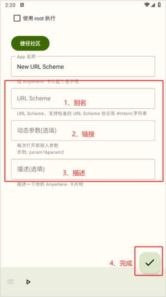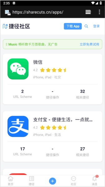 6、不清楚URL Scheme链接的话,可到左上角的“捷径社区”里查找,或者通过搜索引擎搜索App名称加URL Scheme的方式试着找找看。