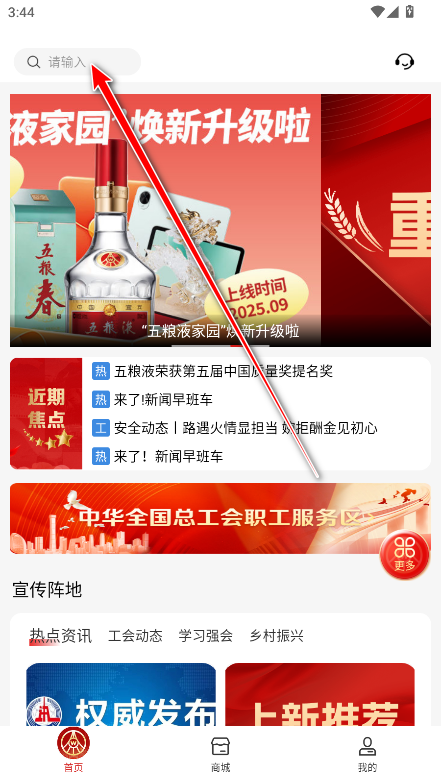1、首先你需要在本站安装五粮液家园,接着打开该软件,点击首页顶部的搜索框,输入相关关键字,就能找到自己需要的内容了。