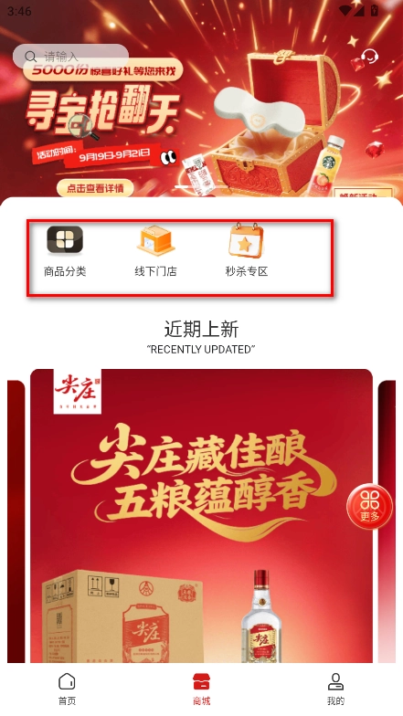 4、可以看到商品分类、线下门店、秒杀专区等板块内容。小编以点击第一个商品分类为例。