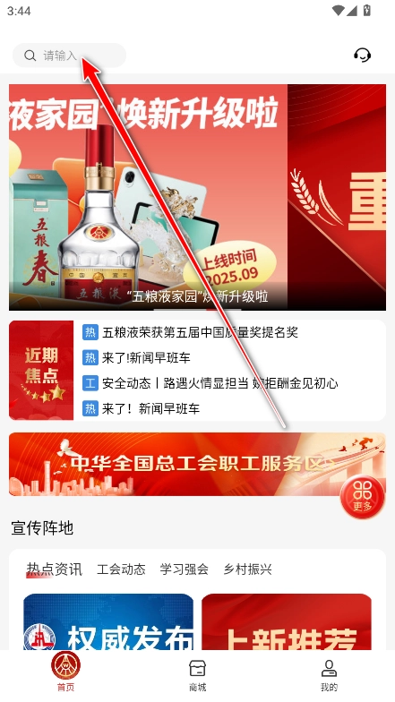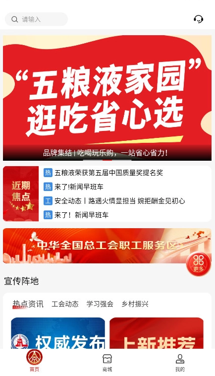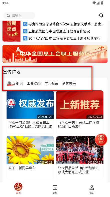 2、继续向下浏览,就能看到宣传阵地板块,其中主要包含最新热点资讯、工会动态、学习强会以及乡村振兴等内容。