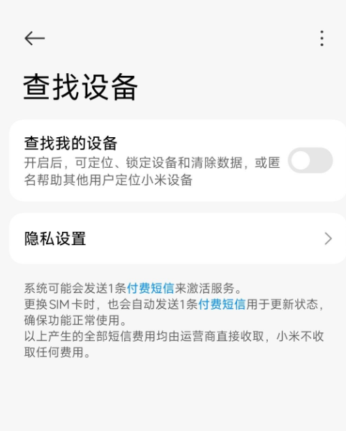 3、进入后直接开启查找本机设备的功能,小米手机首次使用时需要向运营商发送一条收费的验证短信,iPhone则无需此操作。