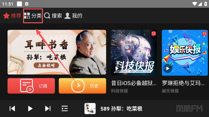 1.启动凤凰FM应用后,在主页能够看到主要展示着最新的订阅内容以及历史板块的相关内容。