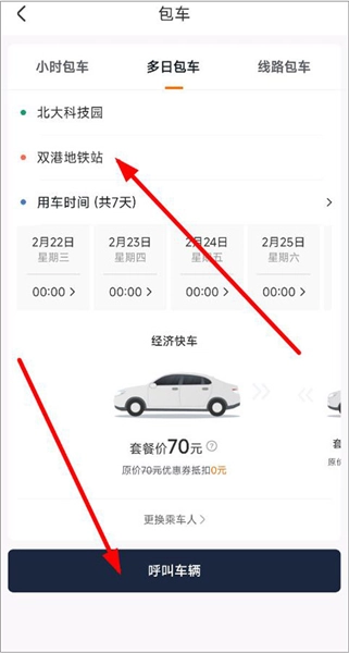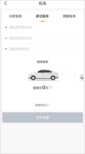 2、进入包车页面后,用户可根据自身需求选择按小时、多日或线路包车的方式。其中,小时包车需填写用车时间;多日包车则需输入出发/到达站点以及用车时间。用户可依据实际需求选择合适的用车类型(例如选择多日包车)。