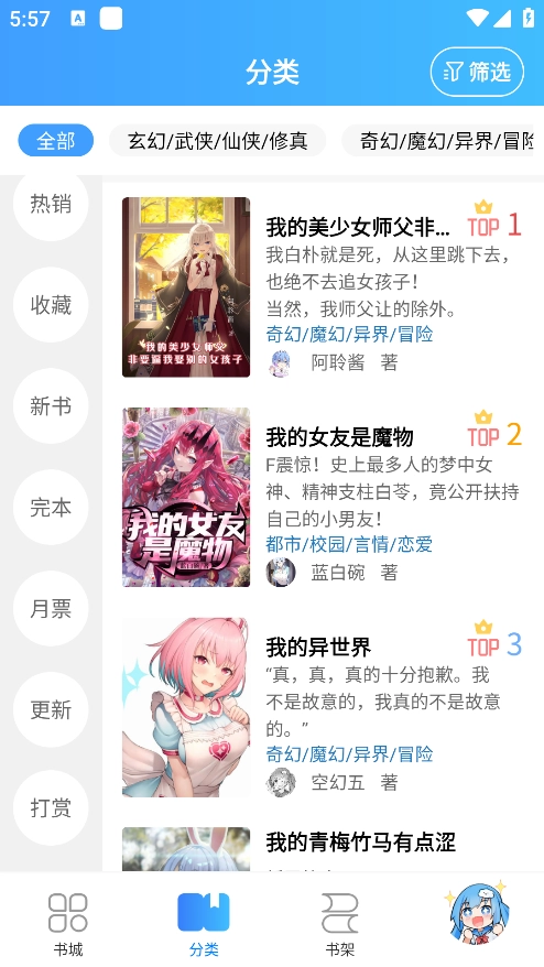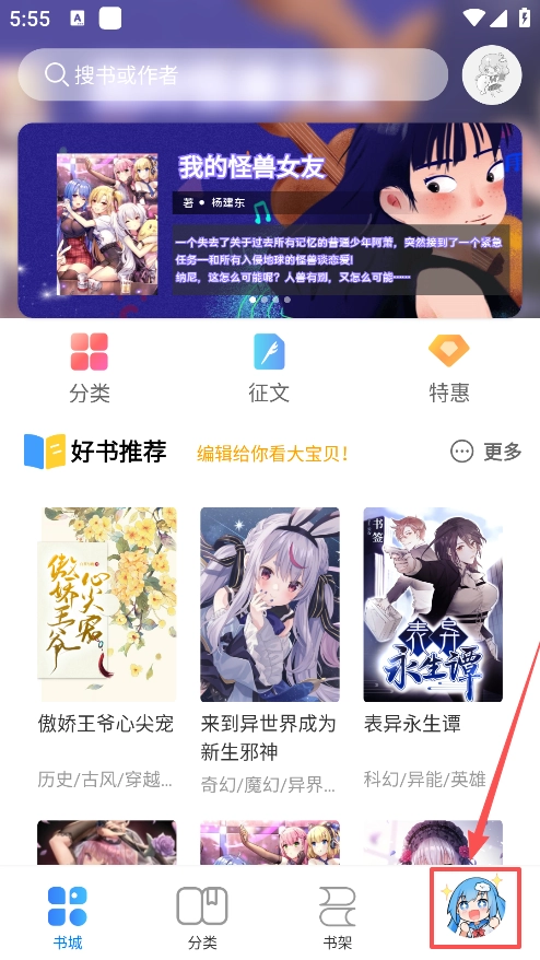 通过分类浏览(如奇幻、科幻、恋爱等)手动查找目标作品。