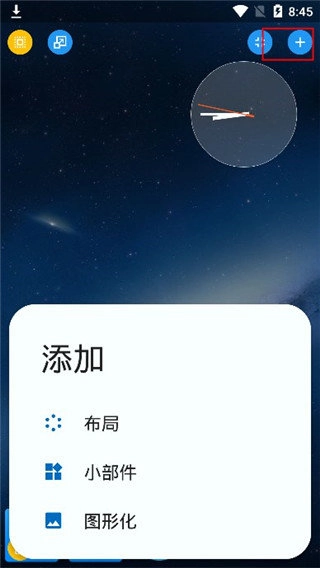 1、打开在本站的软件,点击右上方的+号,可以添加布局、小部件以及图形;