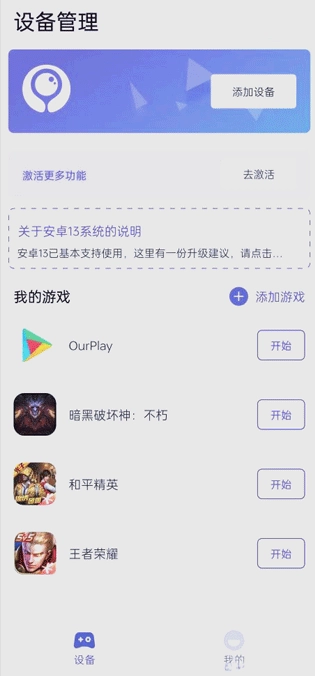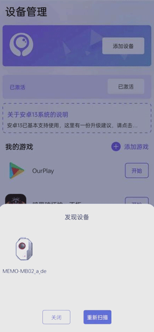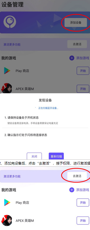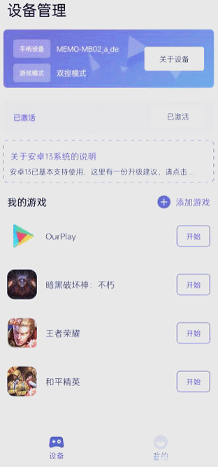 4、当设备蓝灯持续亮起,同时已成功识别手柄设备,且游戏模式显示为“双控模式”时,即表明设备已成功连接,完成激活操作后,点击“开始游戏”就能尽情享受游戏乐趣。