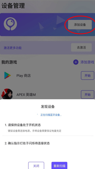 3、第一步,开启设备的电源开关,待蓝灯进入慢闪状态。随后,在软件界面点击“添加设备”并启动扫描,扫描成功后便完成连接流程。
