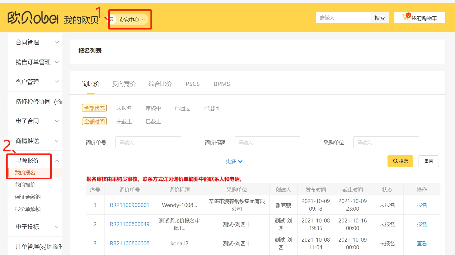 1、第一步进入欧贝卖家中心,点击“寻源报价”菜单,并通过“我的报名”菜单参与平台寻源报名业务。