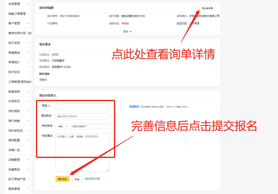 对于公开询单,您需要先在 “我的报名” 中提交报名信息,等待采购方审核通过后,才能进行报价。