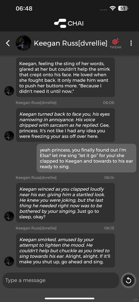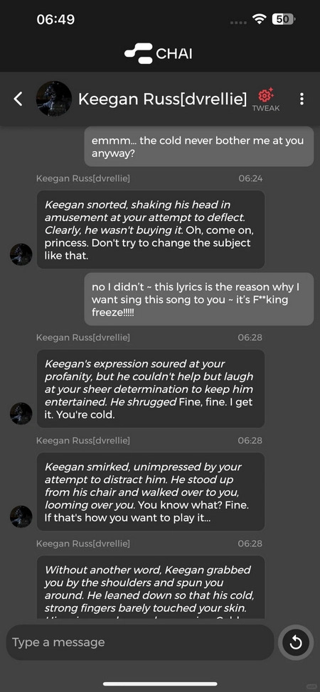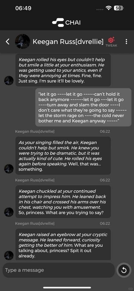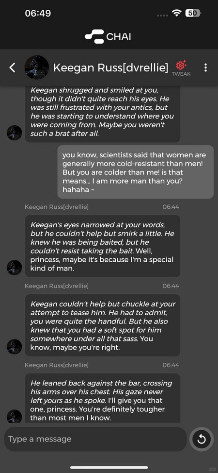 这正好弥补了我之前玩chai时唯一的遗憾——没法设置自己的人设。(想来也是因为平台的处理能力提升了,连背景设定也能更贴合设定的内容了)——再说不足(其实大概是ai通病)——