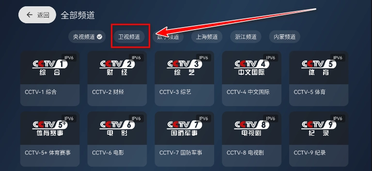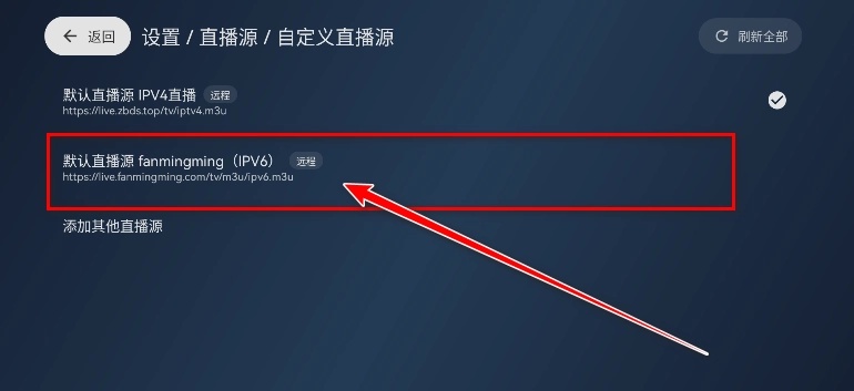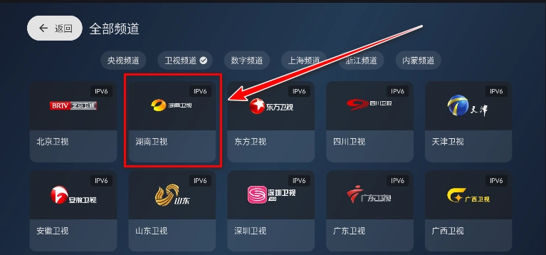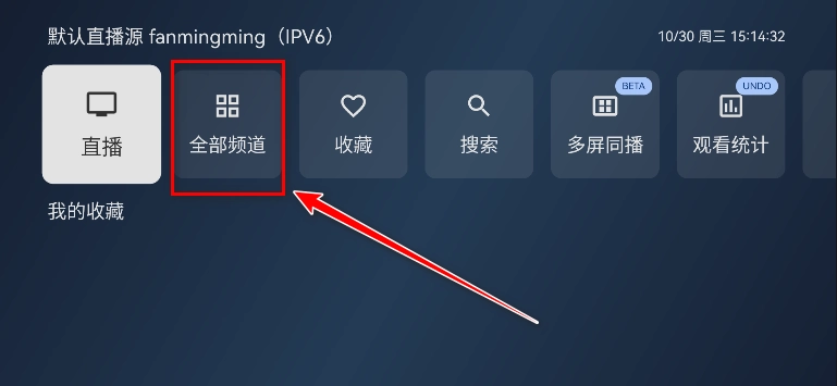 2.您可依据自身网络类型挑选合适的源,系统默认采用ipv4源,若需切换至ipv6源同样支持,具体切换方法请参照上一问题的图文说明。切换为ipv6源后,点击“全部频道”即可。