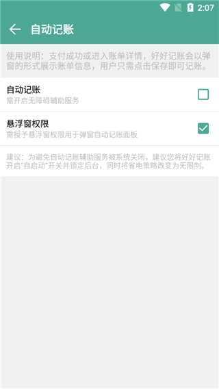 3、进入应用后找到并勾选【自动记账】选项,当支付成功或者进入账单详情页面时,好好记账会弹出一个展示账单信息的窗口,此时你只需点击“保存”按钮,就能完成记账操作。