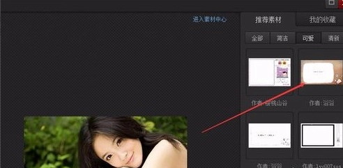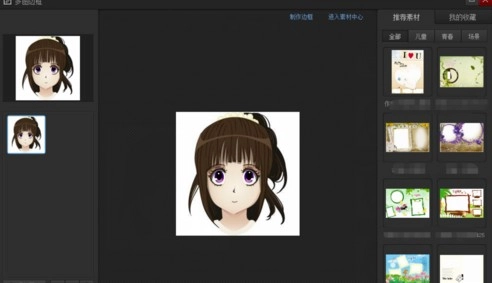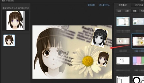 3、页面进入多图边框窗口后,点击窗口右侧的推荐素材按钮,在青春分类下任选一个素材,片刻后页面提示需耐心等待几分钟,此时画布上的照片已与所选素材完整融合。
