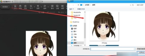 1、在已打开的光影魔术手窗口里点击“打开”按钮,弹出文件选择窗口后,选中待处理的照片(例如222.jpg),再点击“打开”按钮即可。