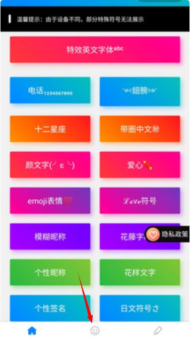 1、我们打开后能在首页看到各式各样的个性功能,点击下方导航栏里的笑脸就能跳转到新页面