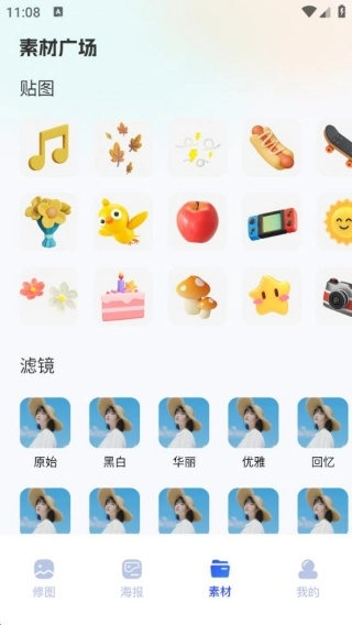 1、素材广场提供多样风格的贴纸、滤镜、背景等,为图片创作提供充足素材支持。