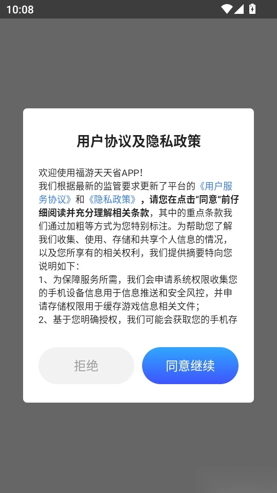 1. 第一步先打开软件,仔细阅读隐私政策与相关协议,确认无误后点击“同意继续”按钮进入下一步。