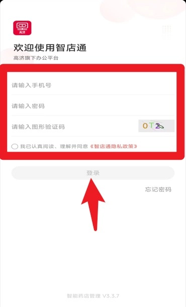 1、启动智店通应用,依次输入手机号、密码与验证码,勾选相关协议条款后,点击登录按钮完成操作。