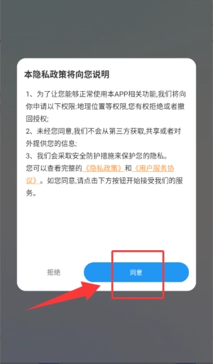 1、首次启动应用,请在隐私政策弹窗点击同意进入。
