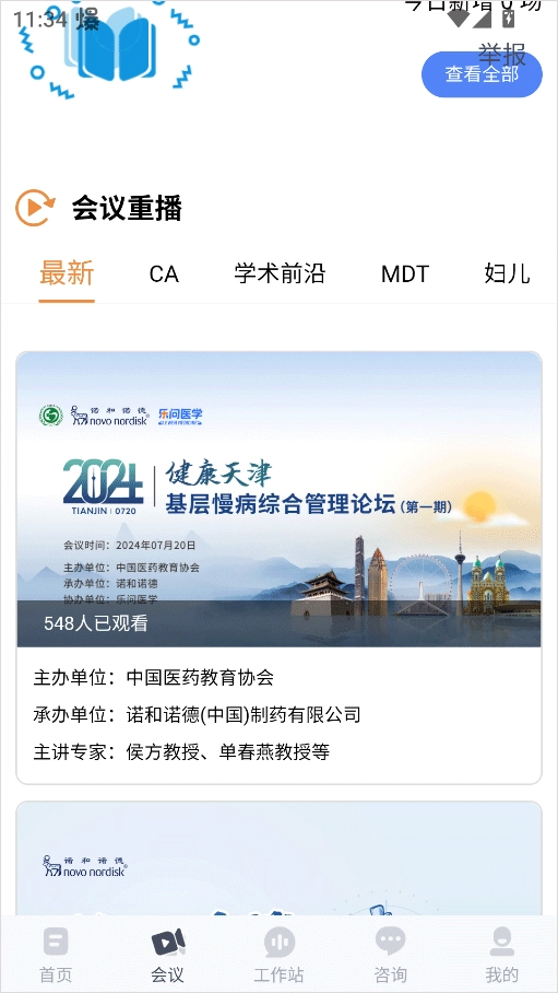 2、会议模块:可查看学术会议列表、会议直播与直播预告,并能实时参与学术交流活动。