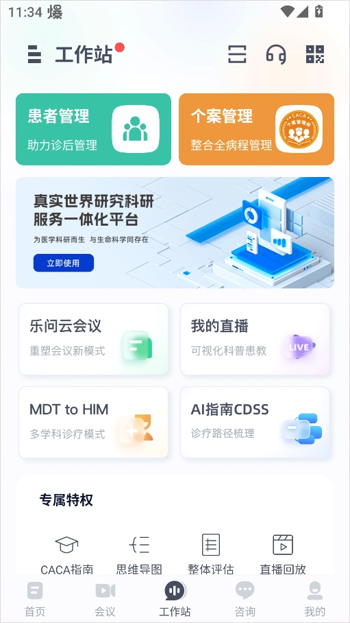 3、工作站功能:涵盖患者管理、个人档案、我的直播及专属特权等板块。