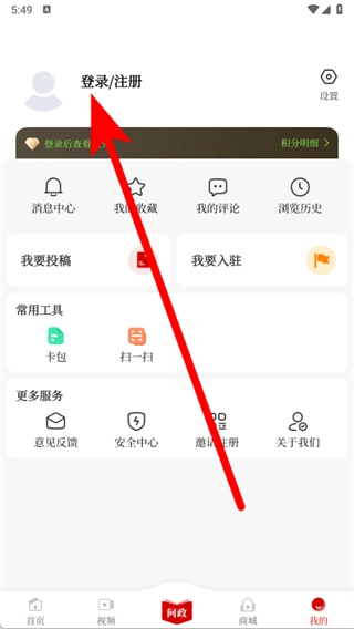2、在个人中心页面,点击登录注册区域,进入手机号登录界面。