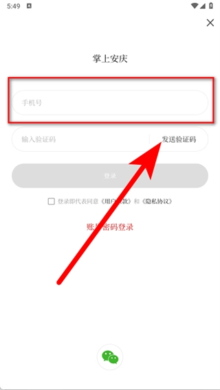 3、在登录界面,输入框中填写号码,点击发送验证码按钮。