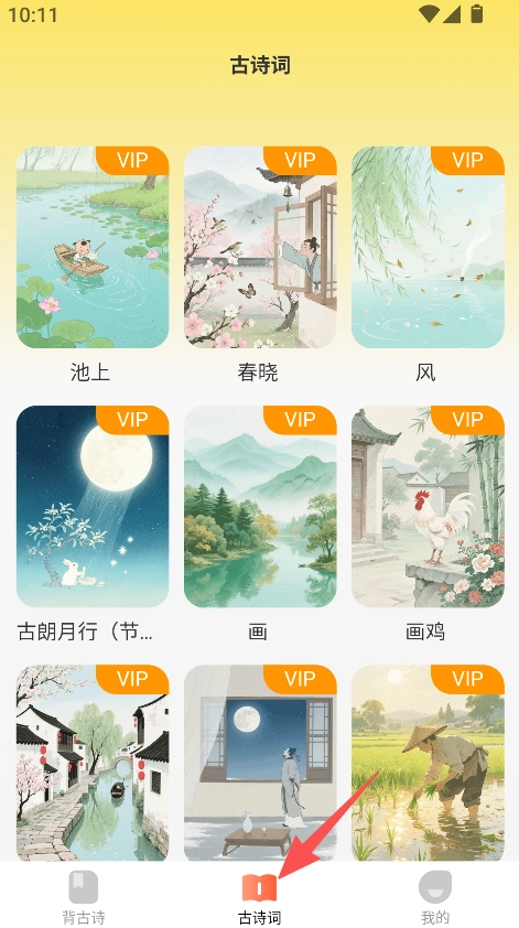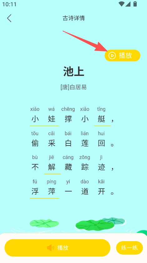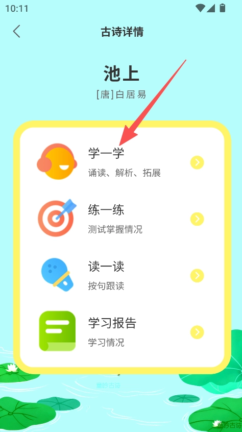 1、打开软件,点击古诗词,选择要学习的古诗(如《池上》)。
