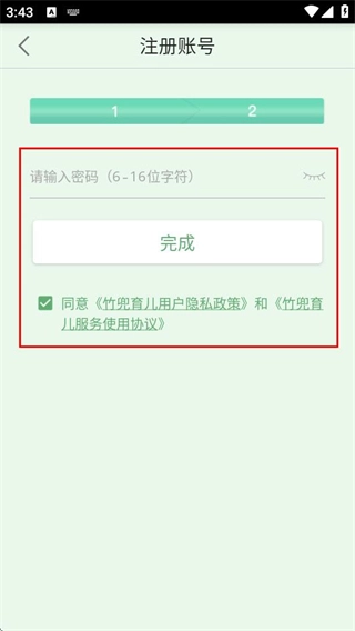5、在密码设置页面,设置密码后点击完成,完成账号注册。