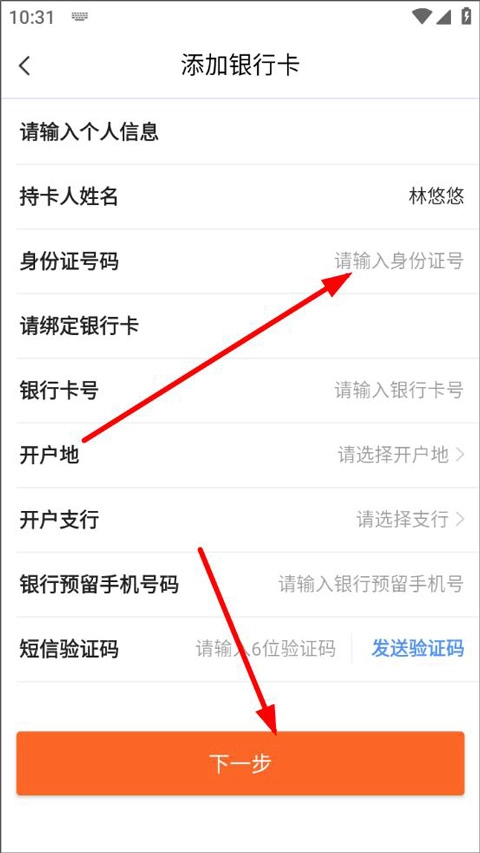 5、在添加银行卡的页面中,用户需填写持卡人姓名、身份证号码、银行卡号、开户地、开户支行等个人信息,填写完成后点击“下一步”提交,即可完成银行卡绑定操作。