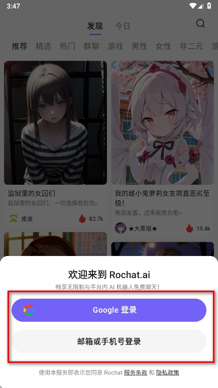 2.可以看到本软件支持Google账号登录、邮箱登录以及手机号登录这几种方式。下面小编就以选择后两种方式(邮箱或手机号)登录为例来进行演示。
