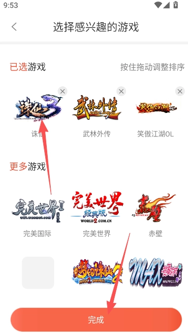 3、挑选你感兴趣的游戏进行拖动排序,社区将依据你的选择为你推送各类内容信息。