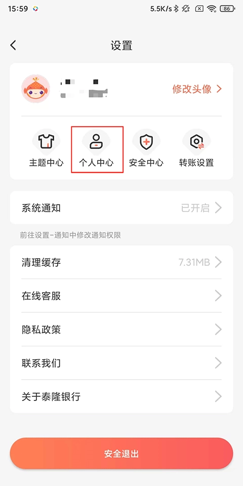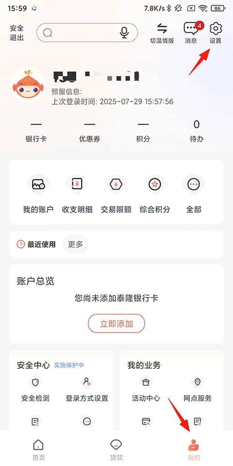 1、打开泰隆银行,点击我的-右上角设置图标;