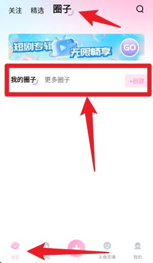 2、点击底部的“社区”选项后进入圈子板块,在“我的圈子”页面中,你可以查看已经加入的圈子,也可以点击创建按钮来建立新的圈子。