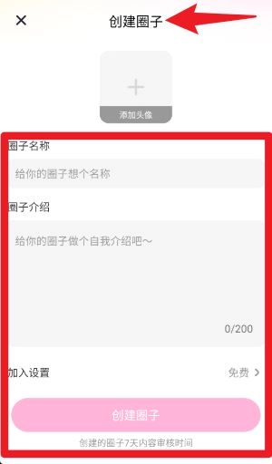 3、进入创建圈子的页面后,填写圈子的名称与介绍,同时设置好加入权限,在确认所有信息都准确无误后,点击页面下方的按钮,就能完成圈子的创建操作。