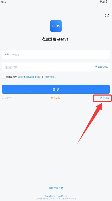 1、首先打开应用后点击右下角快速注册按钮,开始创建您的个人账户信息资料。