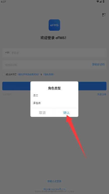 2、根据实际身份选择员工或承包商等角色类型,确认后进入下一步操作流程界面。