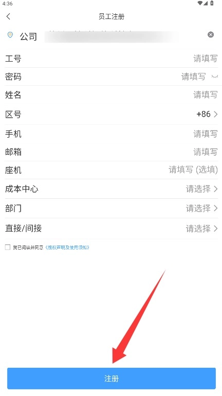 4、填写工号密码等必要个人信息内容,确认无误后点击注册提交完成账号注册流程。