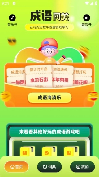 1、摆脱传统成语学习的单调乏味,借助游戏化的形式引导用户积极主动地参与到成语学习当中。