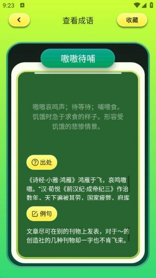 3、成语解析十分全面,每一个成语都搭配了详尽的释义、出处以及例句,能为用户提供多维度的成语知识讲解。