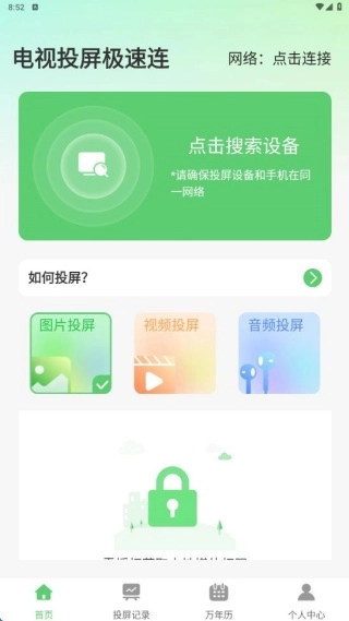 1、安装后在首页即可查看,这里展示了图片、视频、音频投屏服务,同时也具备投屏设置功能。