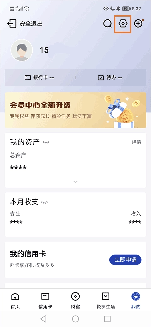 1、首先,打开软件,在软件我的界面找到并点击“银行卡--”一栏;