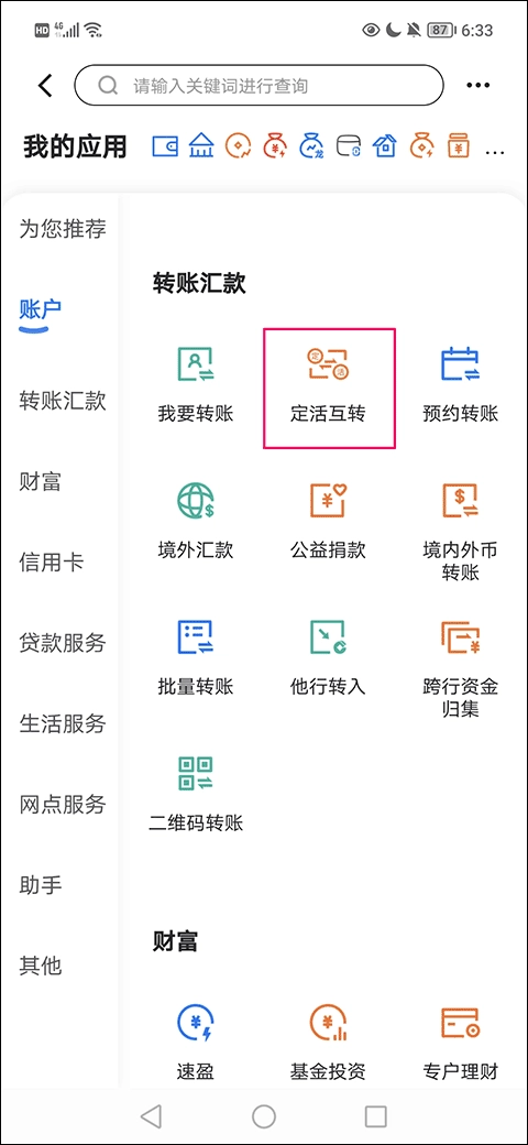 2、然后,在更多界面的转账汇款一栏中找到并点击“定活互转”选项;